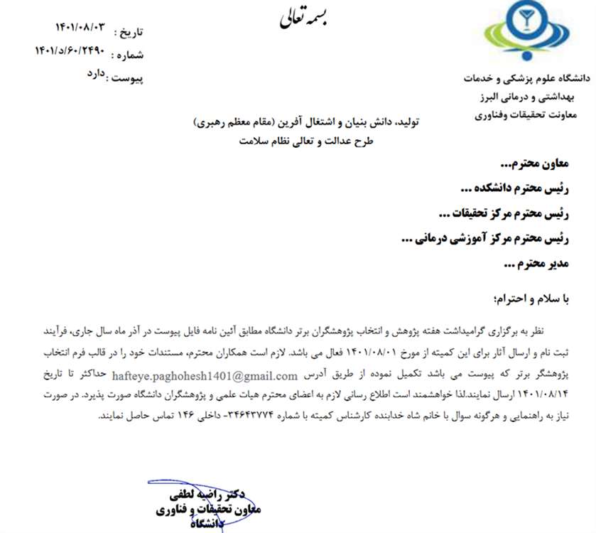 نظر به برگزاری هفته پژوهش و انتخاب پژوهشگر برتر، همکاران میتوانند مستندات خود را در قالب فایل پیوست به معاونت تحقیقات ارسال نمایند.