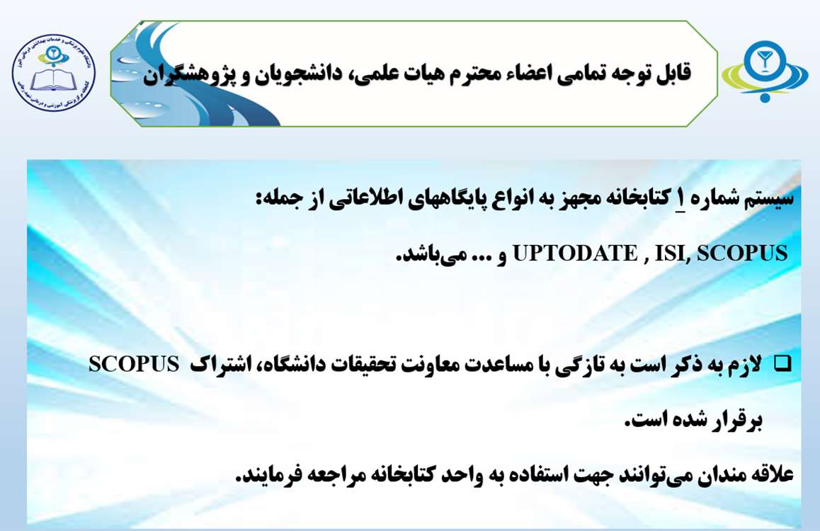لازم به ذکر است به تازگی با مساعدت معاونت تحقیقات دانشگاه، اشتراک SCOPUS   برقرار شده است.
