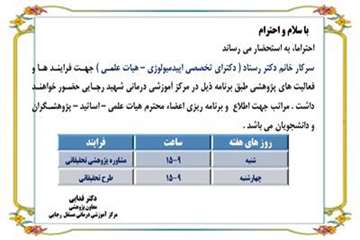 بدینوسیله به اطلاع میرساند خانم دکتر رستاد (دکترای اپیدمیولوژیست) روزهای شنبه و چهارشنبه در مرکز آموزشی درمانی شهید رجایی فعالیت خواهند داشت.