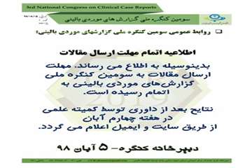 ضمن تشکر از ارسال چکیده مقالات به سومین کنگره ملی، بدینوسیله به اطلاع می‌رساند مهلت ارسال مقالات به کنگره ملی گزارشهای موردی بالینی به اتمام رسیده است. نتایج بعد از داوری در هفته آخر آبان ماه از طریق سایت و ایمیل اعلام خواهد شد.