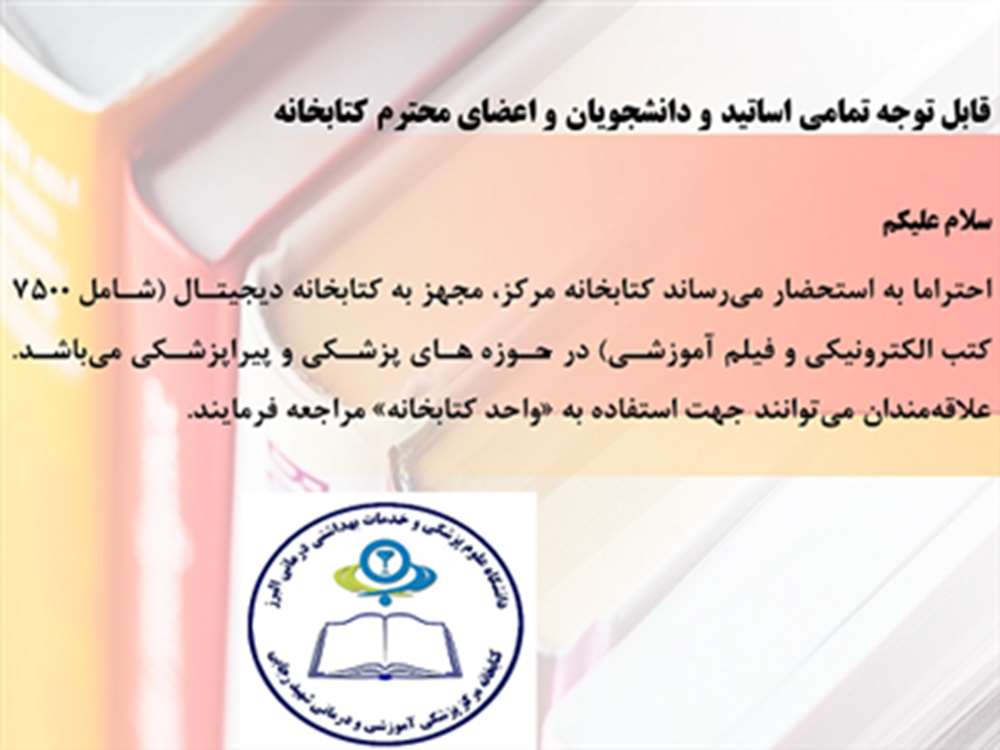 احتراما به استحضار می رساند کتابخانه مرکز، مجهز به کتابخانه دیجیتال (شامل 7500 کتب الکترونیکی و فیلم آموزشی) در حوزه های پزشکی و پیراپزشکی می باشد. علاقه مندان می توانند جهت استفاده به واحد کتابخانه مراجعه فرمایند.