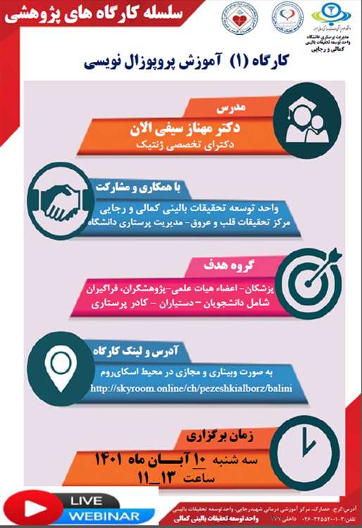 واحد توسعه تحقیقات بالینی رجایی با همکاری واحد توسعه تحقیقات بالینی کمالی کارگاه آموزش پروپوزال نویسی را بصورت حضوری در بیمارستان کمالی و بصورت مجازی برگزار میکند.