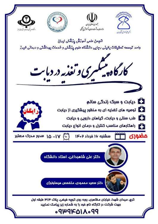 اطلاع رسانی كارگاه پیشگیری و تغذیه در دیابت با همكاری واحد توسعه تحقیقات بالینی رجایی