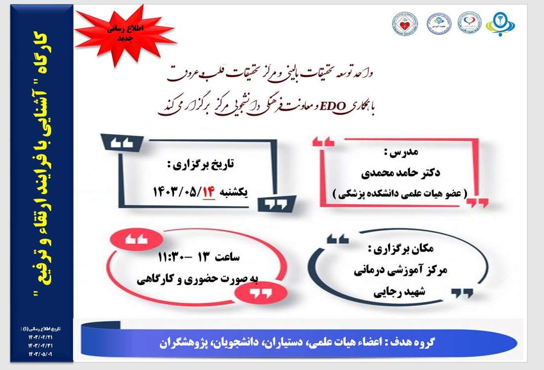 کارگاه آشنایی با فرایند ارتقاء و ترفیع اعضای هیات علمی در روز 14 مرداد 1403 در مرکز آموزشی درمانی شهید رجایی بصورت حضوری برگزار میگردد.