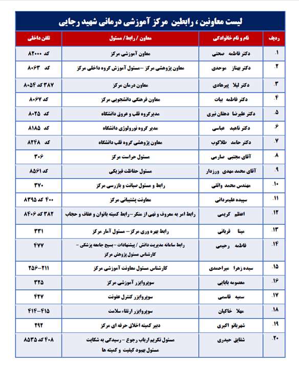 لیست معاونین و رابطین مرکز آموزشی درمانی شهید رجایی