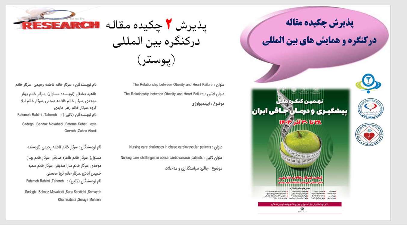دو چکیده مقاله از مرکز بصورت پوستر در نهمین کنگره ملی کنترل و پیشگیری از چاقی ایران پذیرفته شد.