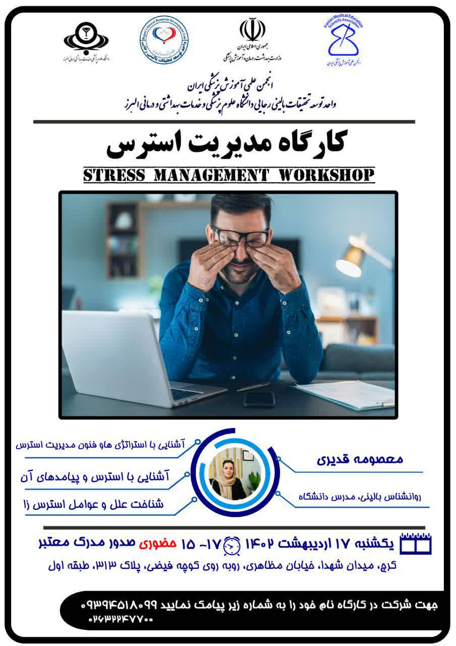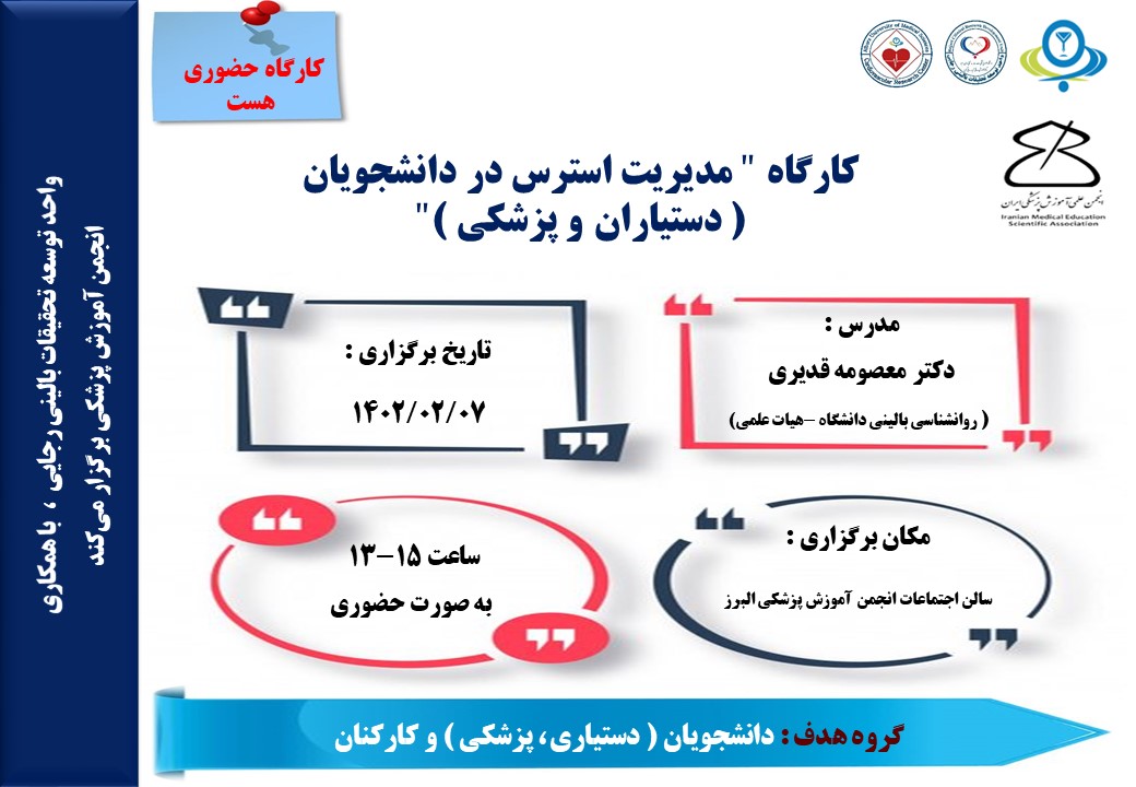 سالن اجتماعات انجمن آموزش پزشکی البرز | دانلود فایل | دکتر معصومه قدیری | 1402/02/07 | مدیریت استرس در دانشجویان | 56 | |