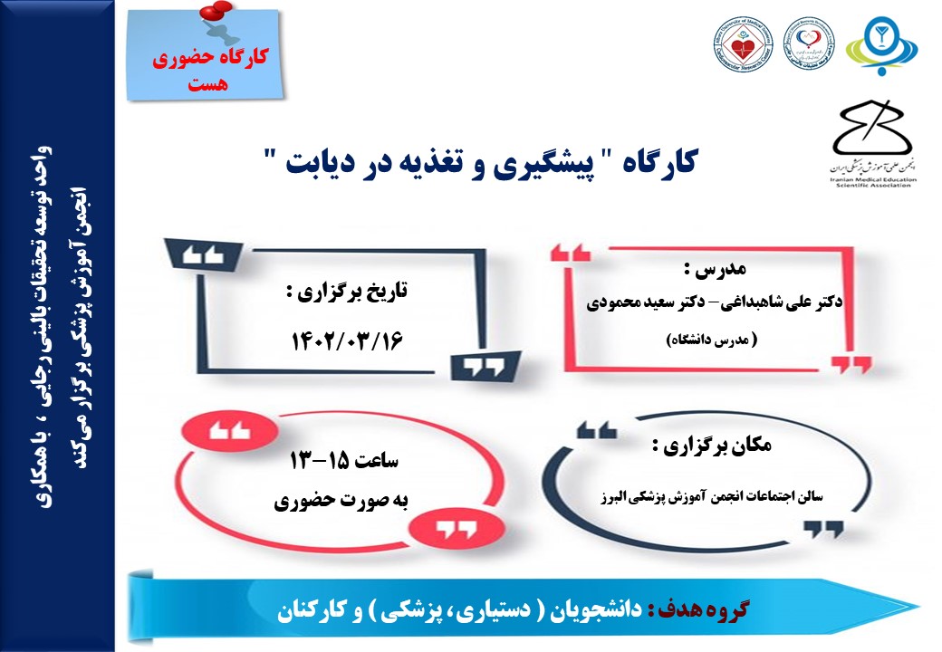 سالن اجتماعات انجمن آموزش پزشکی البرز | دانلود فایل | دکتر علی شاهبداغی- دکتر سعید محمودی | 1402/02/07 | پیشگیری و تغذیه در دیابت | 57 | |