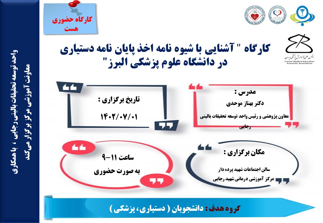 سالن اجتماعات مرکز- حضوری | دانلود فایل | دکتر بهناز موحدی | 1402/07/01 | آشنایی با شیوه نامه اخذ پایان نامه دستیاری در دانشگاه علوم پزشکی البرز | 58 | |