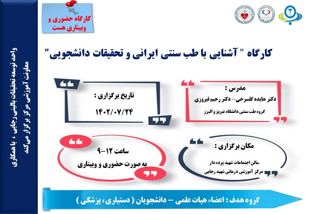 سالن اجتماعات مرکز- حضوری | دانلود فایل | دکتر هایده گلسرخی- دکتر رحیم فیروزی | 1402/07/24 | آشنایی با طب سنتی ایرانی و تحقیقات دانشجویی | 59 | |