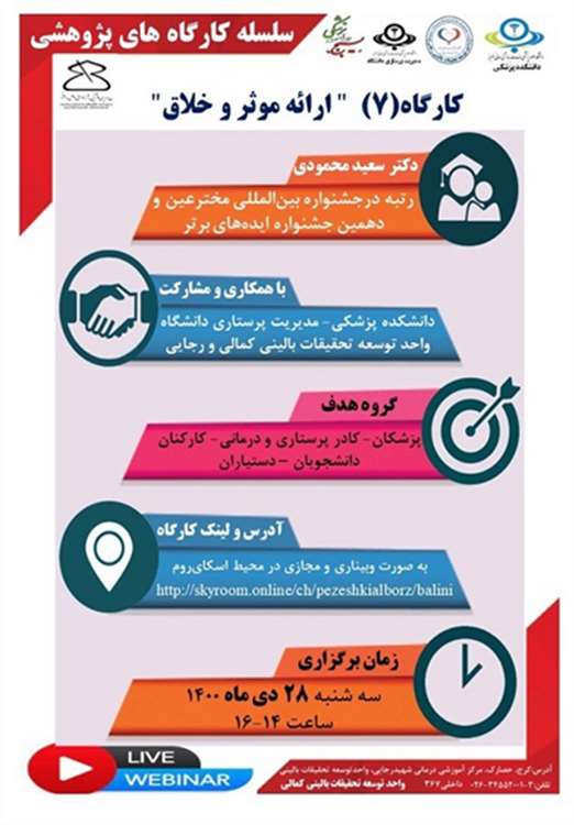 واحد توسعه تحقیقات بالینی رجایی با همکاری دانشکده پزشکی و واحد توسعه تحقیقات بالینی کمالی و مدیریت پرستاری دانشگاه در نظر دارد مورخ 28 دی ماه 1400 ساعت 14- 16 ،کارگاه ارائه خلاق و موثر را بصورت مجازی برگزار نماید . علاقه مندان میتوانند از طریق لینک زیر در کارگاه شرکت نمایند.