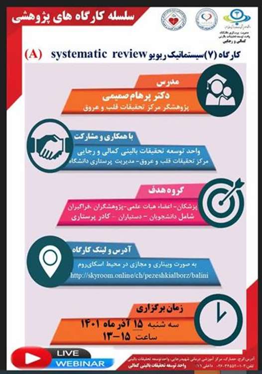 کارگاه سیستماتیک ریویو( A )بصورت مجازی توسط مرکز آموزشی درمانی شهید رجایی و کمالی روز سه شنبه 15 آذر ساعت 13 تا 15 برگزار میشود. علاقه مندان میتوانند در این کارگاه شرکت فرمایند.