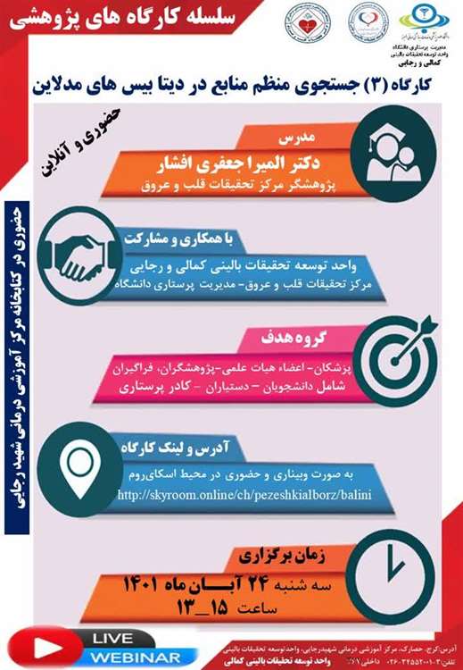 کارگاه جستجوی منظم منابع در دیتابیس مدلاین بصورت مجازی و حضوری در کتابخانه مرکز آموزشی درمانی شهید رجایی روز سه شنبه 24 آبان ساعت 13 تا 15 برگزار میشود. علاقه مندان میتوانند در این کارگاه شرکت فرمایند.