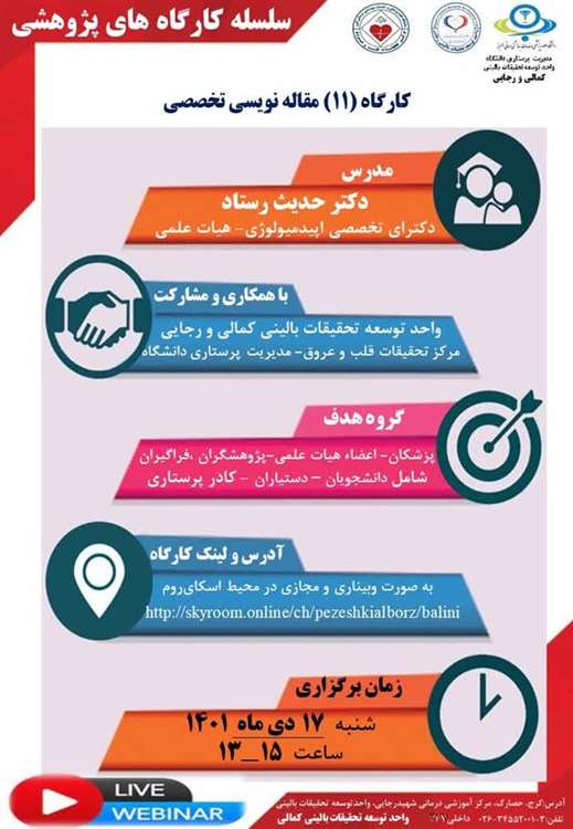 کارگاه مقاله نویسی تخصصی بصورت مجازی توسط مرکز آموزشی درمانی شهید رجایی و کمالی روز شنبه 17 دی ماه ساعت 13 تا 15 برگزار میشود. علاقه مندان میتوانند در این کارگاه شرکت فرمایند.
